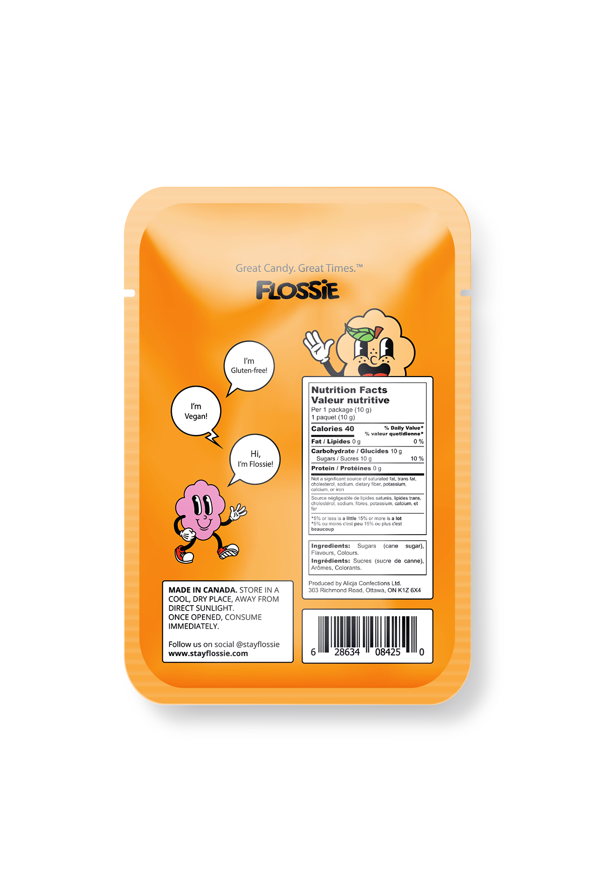 Each package of Flossie contains 40 calories and is crafted with attention to detail. It is gluten-free, vegan, and artisanal.