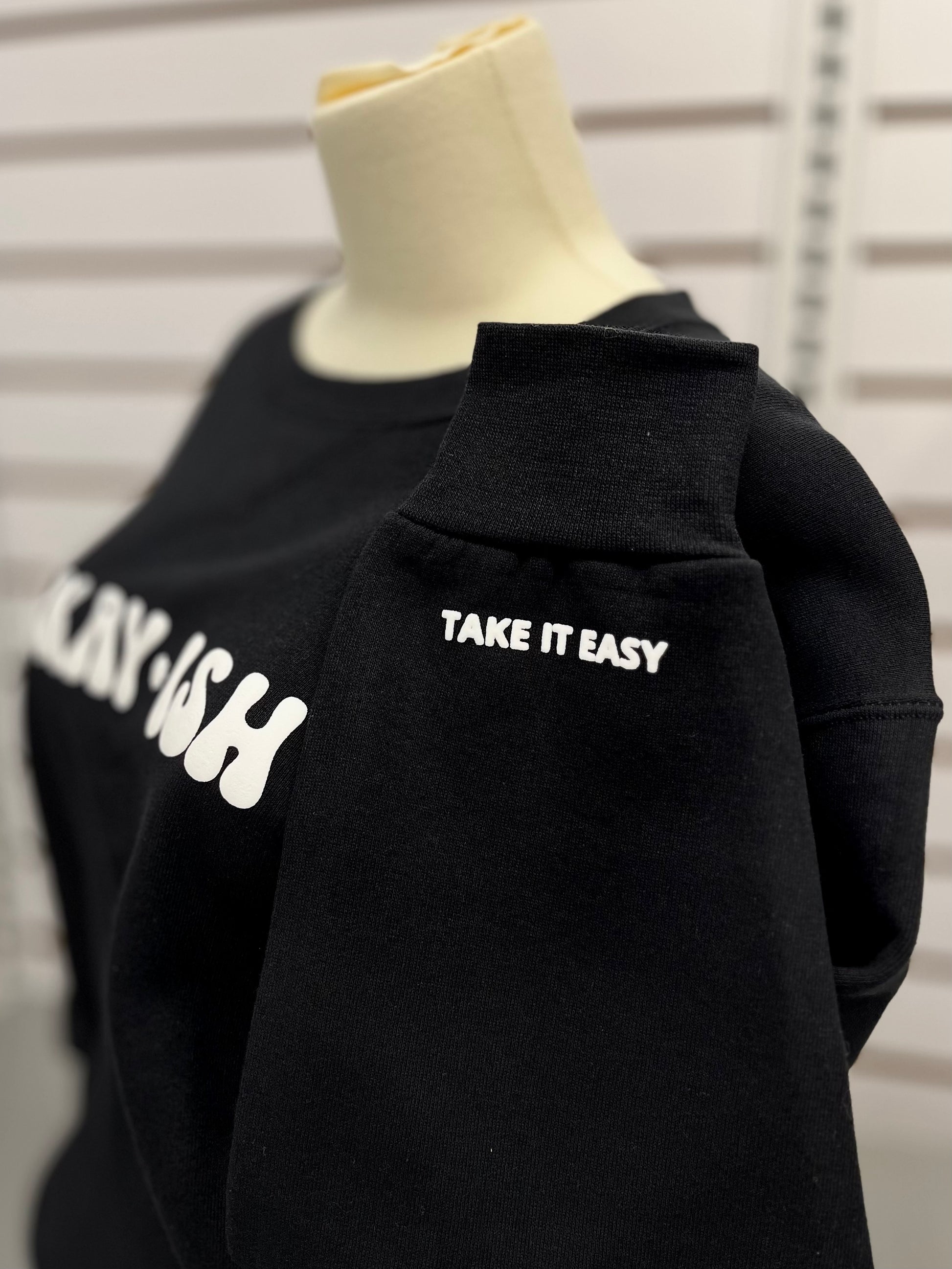 Our NEW Okay-Ish Black Crewneck has been redesigned, comfier and cozier, so you can ruminate on that recent social interaction while looking great. The left sleeve is embroidered with "Take It Easy" as an affirmation to help with moments/ days you just feel stuck.